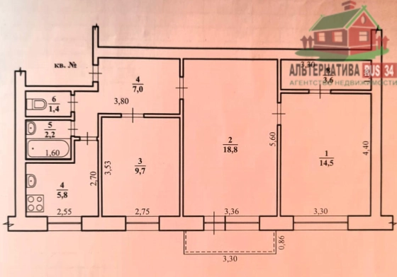 Общая площадь - 63 кв.м., жилая - 43 кв.м., кухня - 6 кв.м.