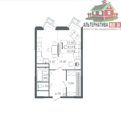 Общая площадь квартиры 43,8 кв.м., жилая – 15,4кв.м., кухня – 11,4 кв.м.